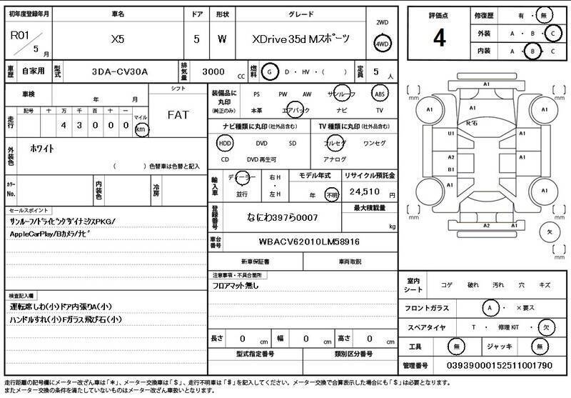This 2019 BMW X5 with the model code CV30A is equipped with a 3,000cc Gasoline engine and has a total mileage of 43,000km.