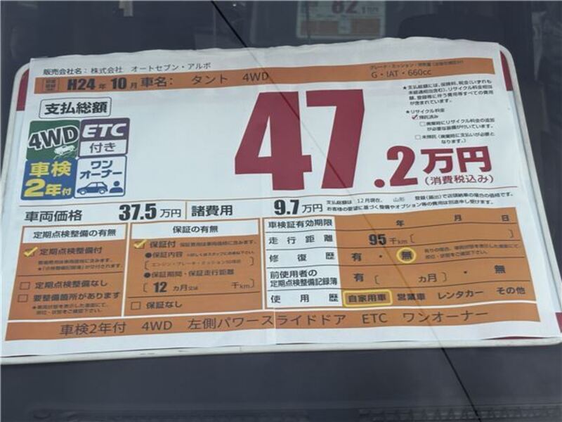 This 2012 DAIHATSU TANTO with the model code L385S is equipped with a 660cc Gasoline engine and has a total mileage of 94,956km.