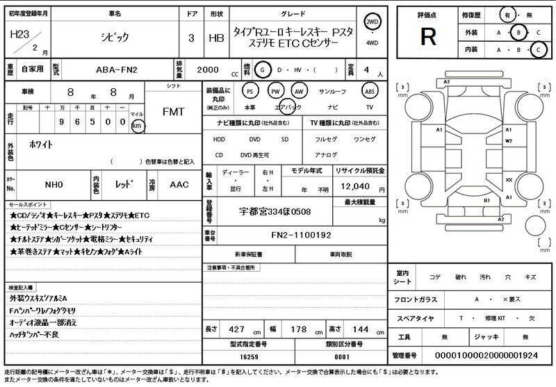 This 2011 HONDA CIVIC with the model code FN2 is equipped with a 2,000cc Gasoline engine and has a total mileage of 97,000km.