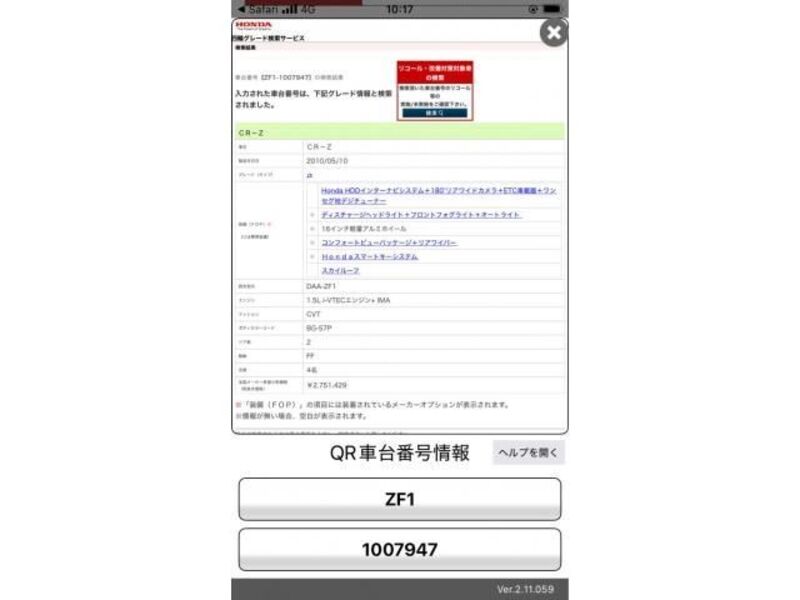 This 2010 HONDA CR-Z with the model code ZF1 and has a total mileage of 177,180km.