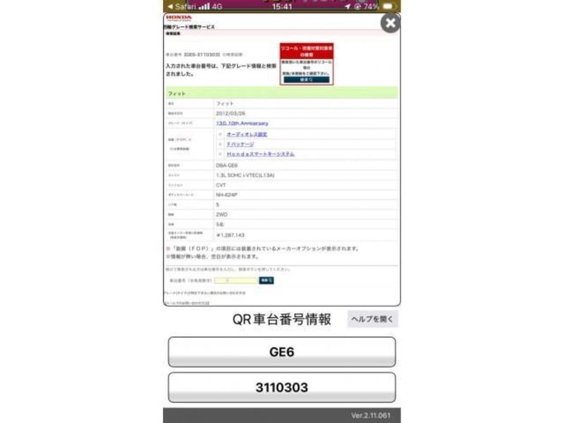 This 2012 HONDA FIT with the model code GE6 is equipped with a 1,300cc Gasoline engine and has a total mileage of 26,688km.