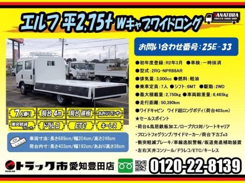 This 2020 ISUZU ELF with the model code NPR88AR is equipped with a 3,000cc Diesel engine and has a total mileage of 50,390km.