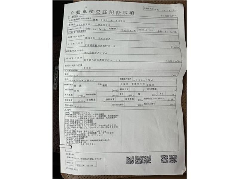 | Chassis No | AXZH10-****Full Chassis No_will be shown on Invoice |