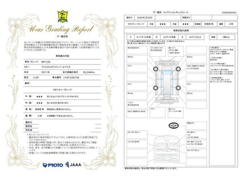 This 2011 MAZDA MPV with the model code LY3P is equipped with a 2,300cc Gasoline engine and has a total mileage of 83,263km.