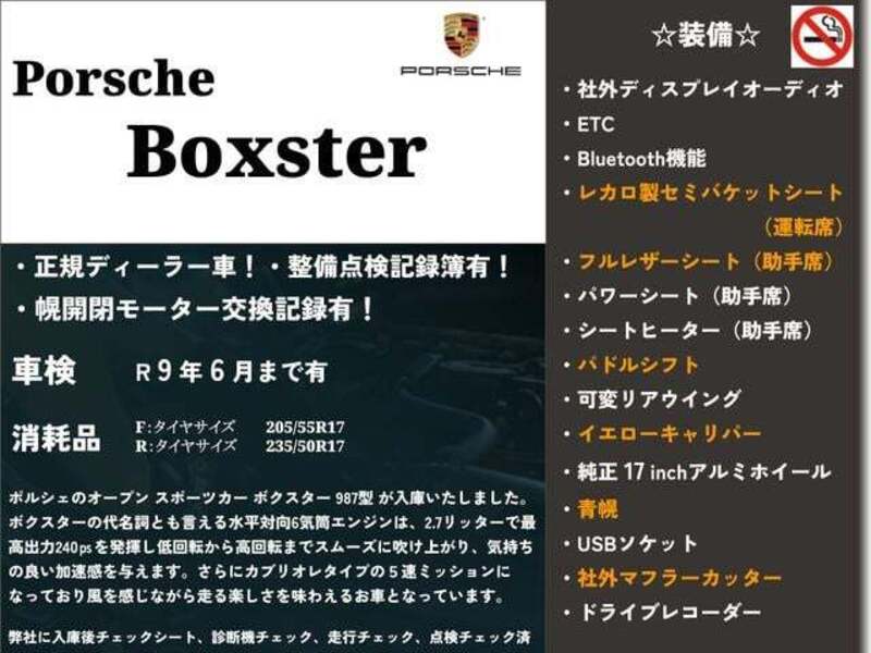 This 2005 PORSCHE BOXSTER with the model code 98725 is equipped with a 2,700cc Gasoline engine and has a total mileage of 96,284km.