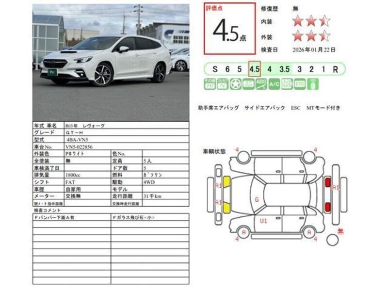 This 2021 SUBARU LEVORG with the model code VN5 is equipped with a 1,800cc Gasoline engine and has a total mileage of 30,840km.