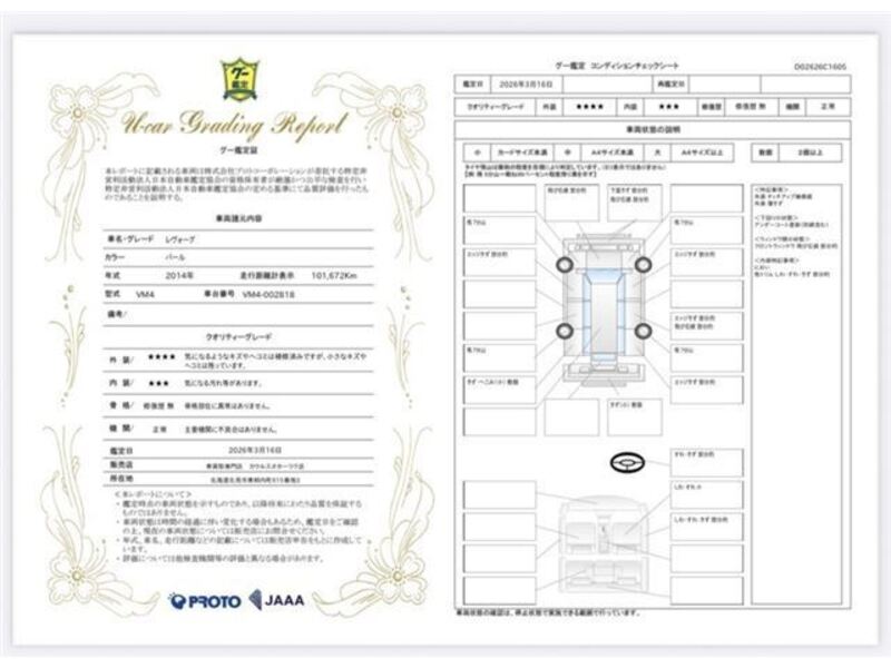 This 2014 SUBARU LEVORG with the model code VM4 is equipped with a 1,600cc Gasoline engine and has a total mileage of 102,000km.