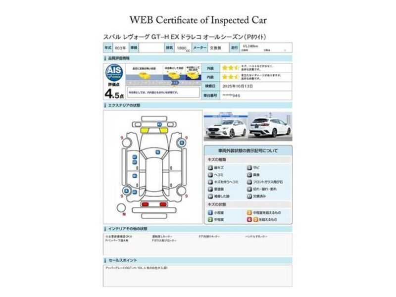 This 2021 SUBARU LEVORG with the model code VN5 is equipped with a 1,800cc Gasoline engine and has a total mileage of 65,248km.