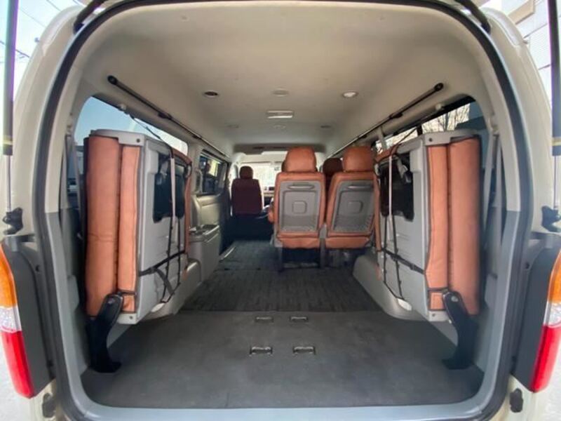 This is a 10-seat Toyota van that is perfect for trips and picking up or dropping off a large number of people. The line of sight has been raised to offer a clear view and provide comfort on long journeys. The interior window areas are also large to provide a sense of openness. The height of the interior makes it easy to get in and out of the vehicle, even to and from the last row of seats. Has a spacious luggage area owing to its seats that can be raised.