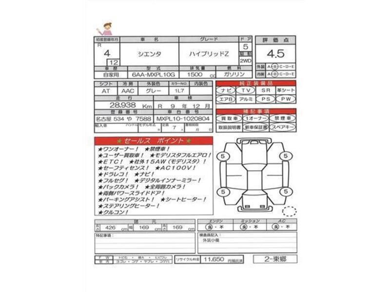 This TOYOTA SIENTA with the model code MXPL10G is equipped with a 1,500cc Gasoline engine and has a total mileage of 28,938km.