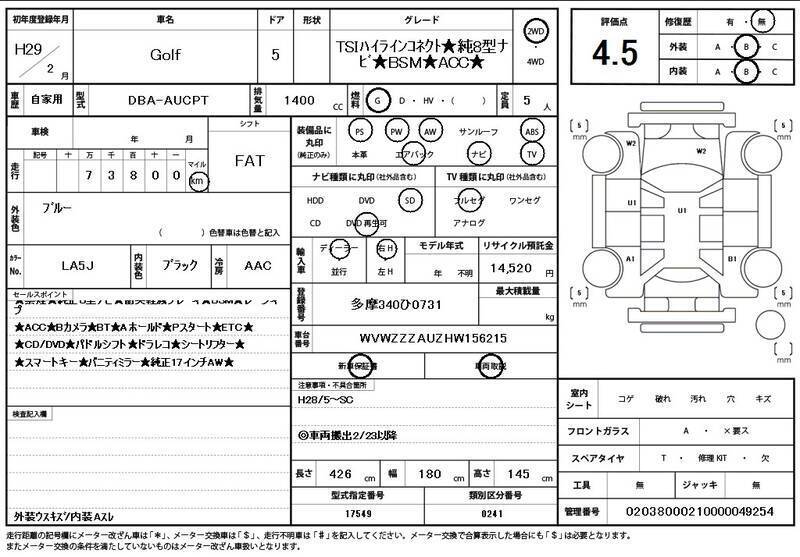 This 2017 VOLKSWAGEN GOLF with the model code AUCPT is equipped with a 1,400cc Gasoline engine and has a total mileage of 74,000km.