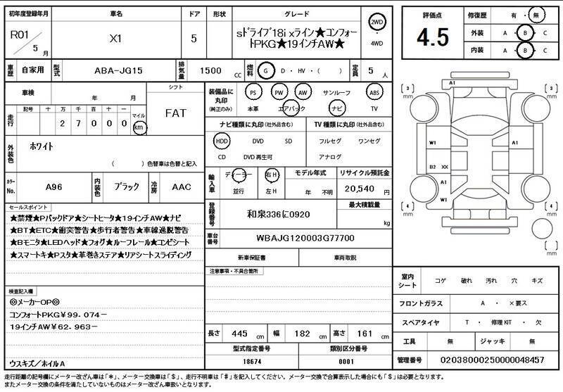 Cette 2019 BMW X1 avec le code de modèle JG15 est équipée d'un moteur de 1,500cc à Essence et a un kilométrage total de 27,000km.