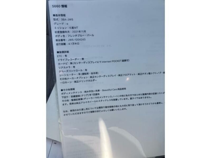 Cette 2021 HONDA S660 avec le code de modèle JW5 est équipée d'un moteur de 660cc à Essence et a un kilométrage total de 41,054km.