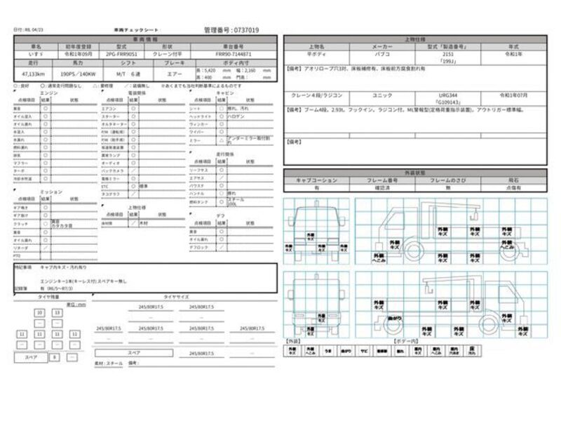 Cette 2019 ISUZU FORWARD avec le code de modèle FRR90S1 est équipée d'un moteur de 5,190cc à Diesel et a un kilométrage total de 47,133km.