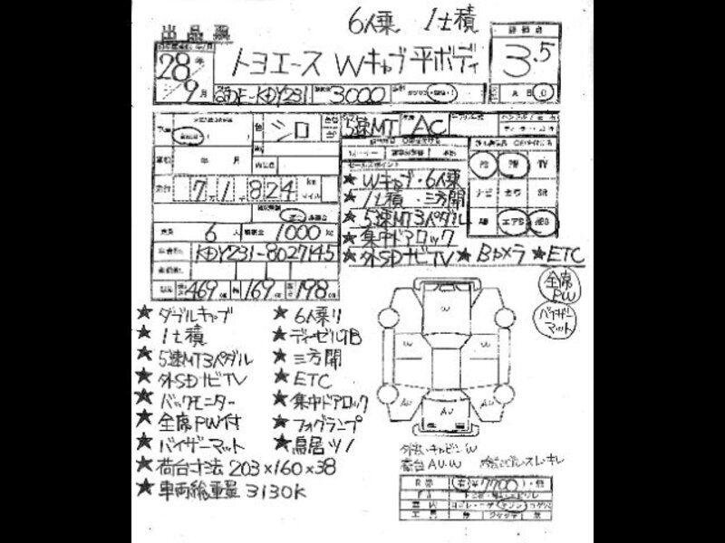 Cette TOYOTA TOYOACE avec le code de modèle KDY231 est équipée d'un moteur de 3,000cc à Diesel et a un kilométrage total de 71,824km.