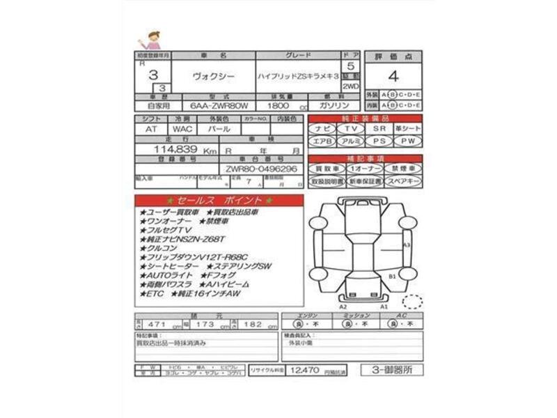 Cette TOYOTA VOXY avec le code de modèle ZWR80W est équipée d'un moteur de 1,800cc à Essence et a un kilométrage total de 114,839km.
