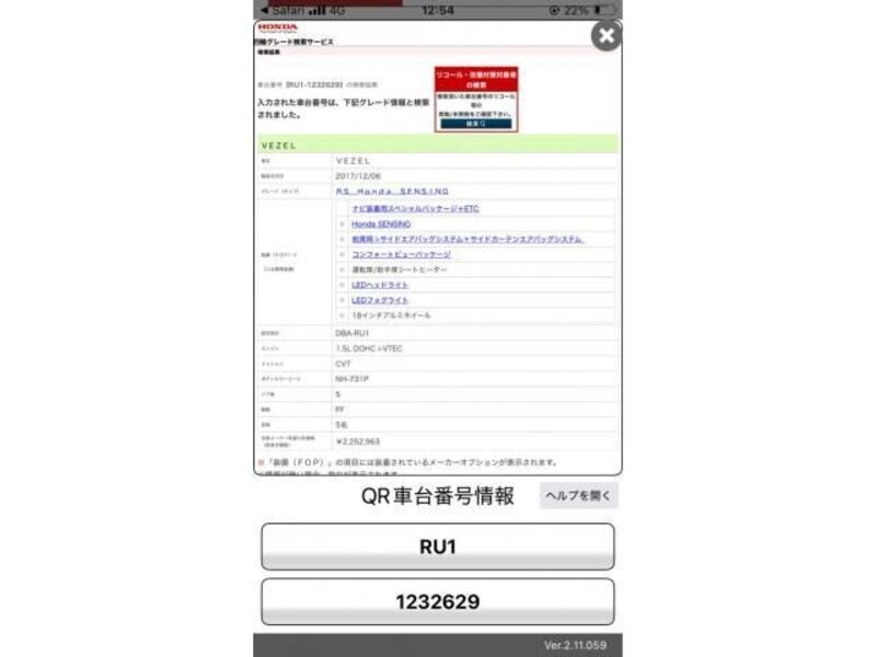 | Type de carrosserie | SUV | Numéro de châssis | RU1-123**** | Code de modèle | RU1 | Modèle de moteur | -- | Volant | -- |