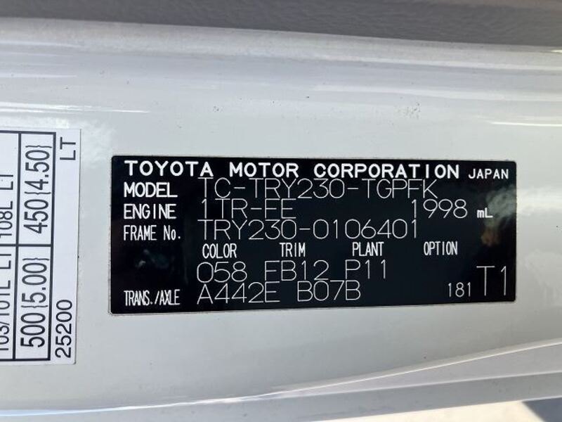 hii 2006 TOYOTA TOYOACE na nambari ya mfano TRY230 imewekwa na injini ya Petroli 1,990cc na ina jumla ya mileage ya 71,878km.